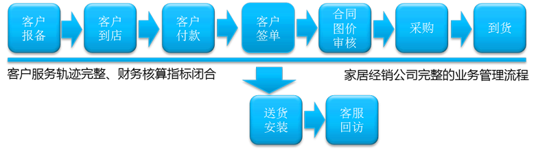 依据家居经销商完整的业务经营链,不断抽象、提炼、验证,最终形成最具行业特点、最符合定制化家居经销企业管理的全业务管理平台, 帮助家居经销企业从客户线索接入到的客户服务生命周期结束整个过程每个环节进行全面管理。